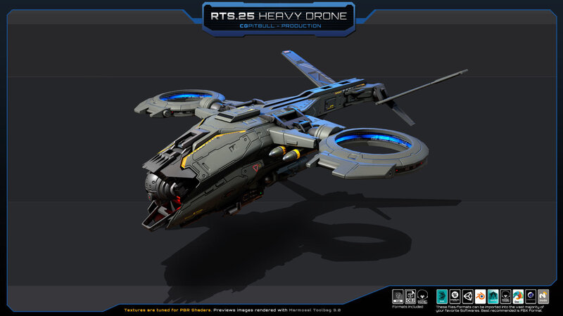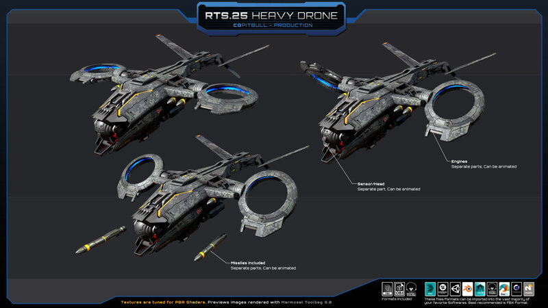 Set of one RTS.25 - Heavy Drone (FBX model). Separated parts: weapons, engines, sensors (NO landing gear included). No animated parts, FX, script or LOD. Check all previews, descriptions and video for full details before buying. (HANGAR in video and previews is NOT included, its just for Artistic purpose).