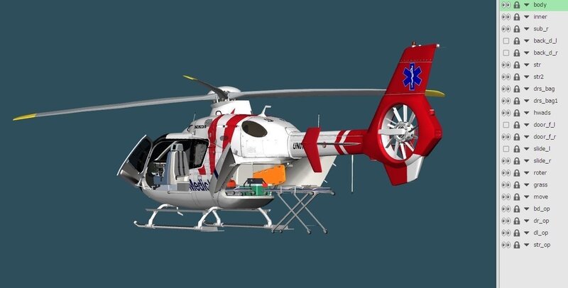 日本のドクターヘリを再現した機体です、メイン&サブローターの回転表現用テクスチャ、 ストレッチャー開閉選択、操縦席ドアと貨物ドアの開閉選択、横スライドドア左右別部品、 内装入りです。実機の塗装色とロゴマークは許可されて居ないのでオリジナルカラーで 作成してあります。