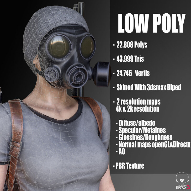 Package contains also Marmoset Toolbag scene with Character, shader setup and assigned textures. This scene was used to generate preview pictures.