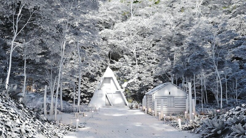 Let's ready to camp? Here a great Full Scene of a modern A - frame Cabin and an ancient rustic cabin inside a wild forest village.