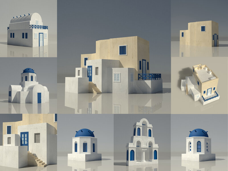 Santorini Blue and White Greek 3D Buildings x 7 Models Low-poly 3D model