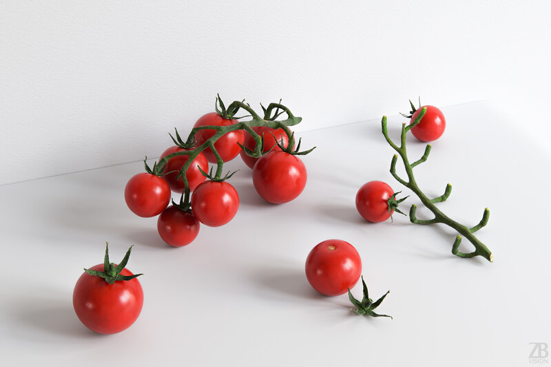 This is a 3d model of cherry tomatoes on a vine. It was scanned and prepared for photorealistic renderings, close-ups, stills and animation. The tomato model is ready to be inserted in your scene out of the box.