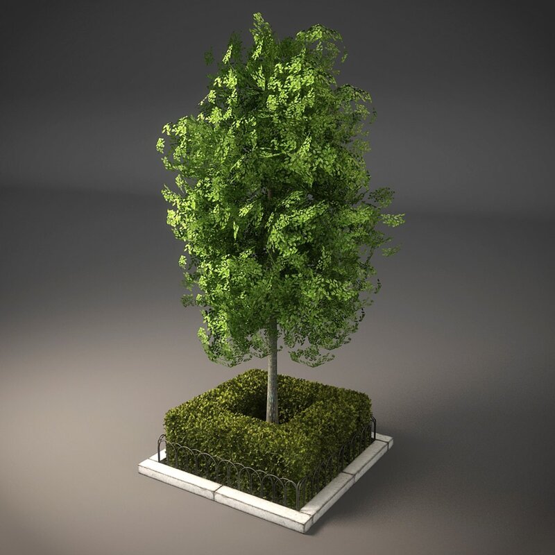 Includes street planter, plus stone base with decorative grill and vegetation. Tree height is approximately 6,5m. Great for architectural rendering or real-time applications.